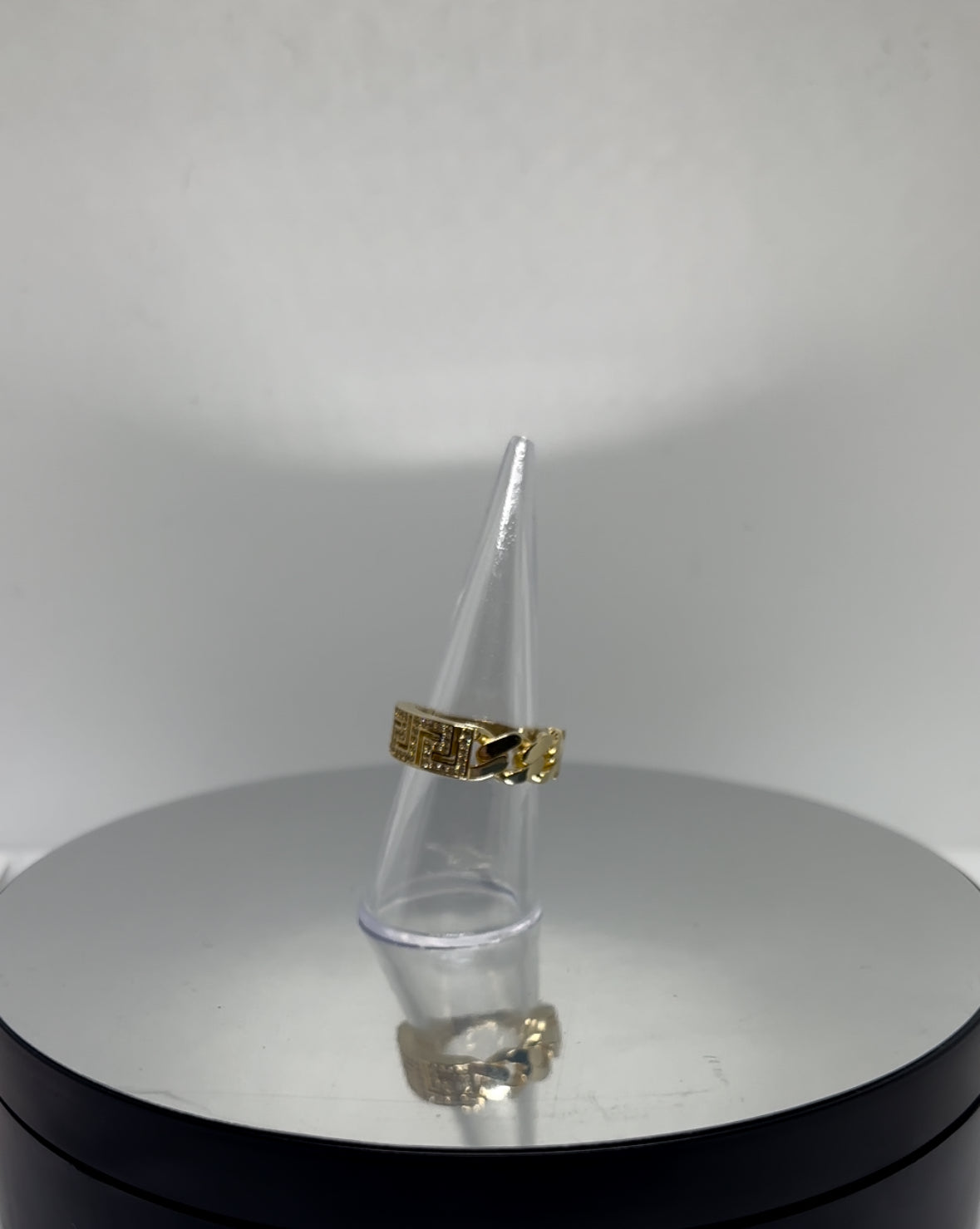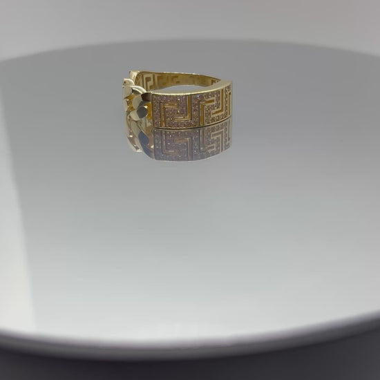 Bold and unique, this 10k gold men’s ring features a powerful combination of the iconic Cuban link design and a detailed Greca pattern, finished with sparkling CZ accents for added shine.